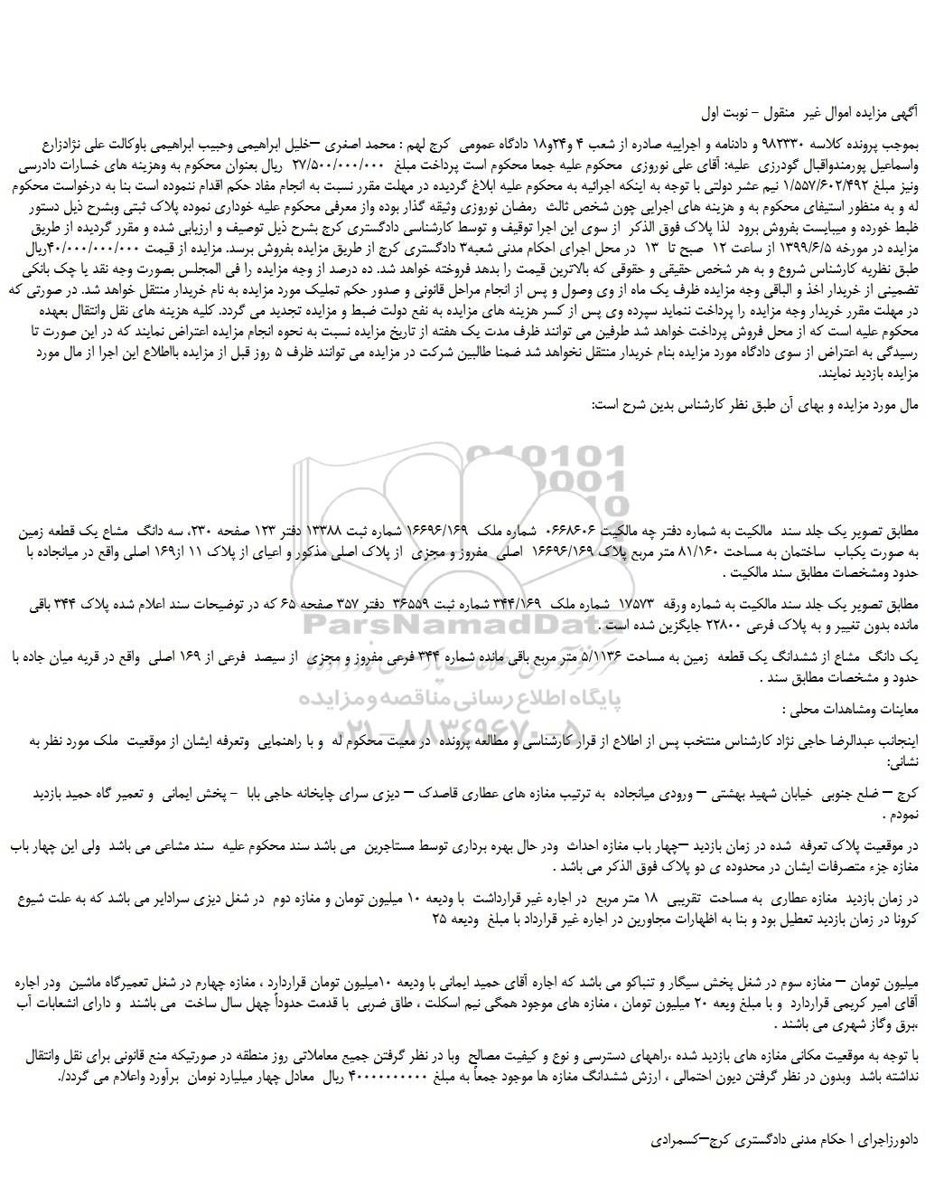 بموجب پرونده کلاسه 982330 و دادنامه و اجراییه صادره از شعب 4 و24و18 دادگاه عمومی  کرج لهم : محمد اصغری –خلیل ابراهیمی وحبیب ابراهیمی باوکالت علی نژادزارع واسماعیل پورمندواقبال گودرزی  علیه: آقای علی نوروزی  محکوم علیه جمعا محکوم است پرداخت مبلغ  27/500/000/000  ریال بعنوان محکوم به وهزینه های خسارات دادرسی ونیز مبلغ 1/557/602/492 نیم عشر دولتی با توجه به اینکه اجرائیه به محکوم علیه ابلاغ گردیده در مهلت مقرر نسبت به انجام مفاد حکم اقدام ننموده است بنا به درخواست محکوم له و به منظور استیفای محکوم به و هزینه های اجرایی چون شخص ثالث  رمضان نوروزی وثیقه گذار بوده واز معرفی محکوم علیه خوداری نموده پلاک ثبتی وبشرح ذیل دستور ظبط خورده و میبایست بفروش برود  لذا پلاک فوق الذکر  از سوی این اجرا توقیف و توسط کارشناسی دادگستری کرج بشرح ذیل توصیف و ارزیابی شده و مقرر گردیده از طریق مزایده در مورخه 1399/6/5 از ساعت 12  صبح تا  13  در محل اجرای احکام مدنی شعبه3 دادگستری کرج از طریق مزایده بفروش برسد. مزایده از قیمت 40/000/000/000ریال طبق نظریه کارشناس شروع و به هر شخص حقیقی و حقوقی که بالاترین قیمت را بدهد فروخته خواهد شد. ده درصد از وجه مزایده را فی المجلس بصورت وجه نقد یا چک بانکی تضمینی از خریدار اخذ و الباقی وجه مزایده ظرف یک ماه از وی وصول و پس از انجام مراحل قانونی و صدور حکم تملیک مورد مزایده به نام خریدار منتقل خواهد شد. در صورتی که در مهلت مقرر خریدار وجه مزایده را پرداخت ننماید سپرده وی پس از کسر هزینه های مزایده به نفع دولت ضبط و مزایده تجدید می گردد. کلیه هزینه های نقل وانتقال بعهده محکوم علیه است که از محل فروش پرداخت خواهد شد طرفین می توانند ظرف مدت یک هفته از تاریخ مزایده نسبت به نحوه انجام مزایده اعتراض نمایند که در این صورت تا رسیدگی به اعتراض از سوی دادگاه مورد مزایده بنام خریدار منتقل نخواهد شد ضمنا طالبین شرکت در مزایده می توانند ظرف 5 روز قبل از مزایده بااطلاع این اجرا از مال مورد مزایده بازدید نمایند.