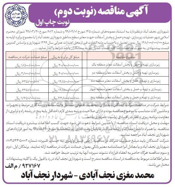 شهرداری نجف آباد در نظر دارد به استناد مصوبه شورای محترم اسلامی شهر عملیات زیرسازی ، تهیه و حمل و پخش آسفالت جهت معابر سطح مناطق شهرداری نجف آباد را با مجموع براورد اولیه به مبلغ 128.000.000.000 ریال بدون تعدیل و با احتساب مابه التفاوت قیر از محل اعتبارات عمرانی سال 99 شهرداری و براساس کمترین قیمت پیشنهادی به صورت مناقصات جداگانه حسب جدول زیر به پیمانکاران واجد شرایط واگذار نماید.