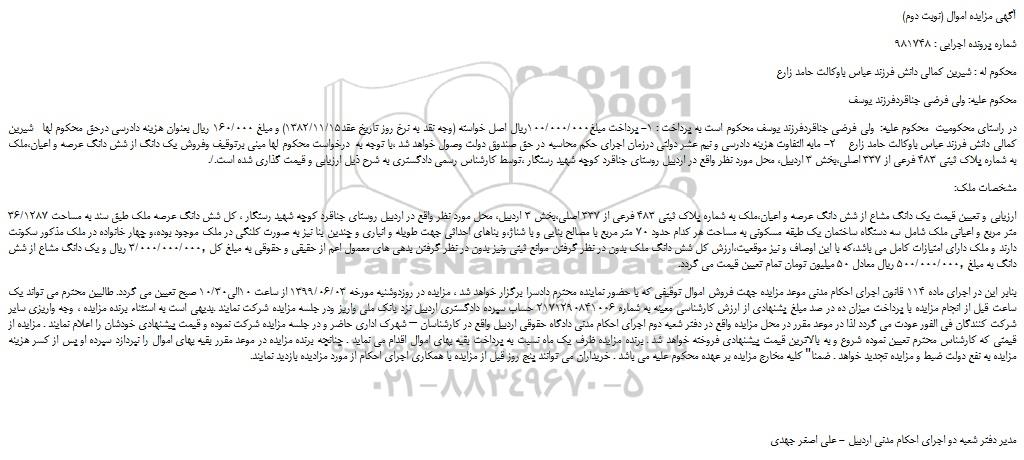 در راستای محکومیت  محکوم علیه:  ولی فرضی جناقردفرزند یوسف محکوم است به پرداخت : 1- پرداخت مبلغ100/000/000ریال اصل خواسته (وجه نقد به نرخ روز تاریخ عقد1382/11/15) و مبلغ 160/000 ریال بعنوان هزینه دادرسی درحق محکوم لها   شیرین کمالی دانش فرزند عباس باوکالت حامد زارع    2- مابه التفاوت هزینه دادرسی و نیم عشر دولتی درزمان اجرای حکم محاسبه در حق صندوق دولت وصول خواهد شد ،با توجه به  درخواست محکوم لها مبنی برتوقیف وفروش یک دانگ از شش دانگ عرصه و اعیان،ملک به شماره پلاک ثبتی ۴۸۳ فرعی از ۳۳۷ اصلی،بخش ۳ اردبیل، محل مورد نظر واقع در اردبیل روستای جناقرد کوچه شهید رستگار ،توسط کارشناس رسمی دادگستری به شرح ذیل ارزیابی و قیمت گذاری شده است./.