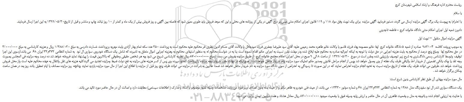 به موجب پرونده کلاسه  982104  صادره از شعبه 5 دادگاه خانواده کرج  لها: خانم معصومه بهاء فرزند قاسم با وکالت خانم طاهره محمد رحیمی علیه: آقای سید علیرضا جعفری فرزند سیدجلال با وکالت آقای حسام الدین نظری فر محکوم علیه محکوم است به پرداخت 250 عدد سکه تمام بهار آزادی بابت مهریه و پرداخت خسارت دادرسی به مبلغ 1/388/020 ریال و هزینه کارشناسی به مبلغ 3/000/000 در حق محکوم لها  ومبلغ پنج درصد از محکوم به بابت هزینه اجرایی در حق دولت با توجه به اینکه اجرائیه صادره به محکوم علیه ابلاغ شده ودر مهلت مقرر نسبت به اجرای حکم اقدام ننموده است بنا به در خواست محکوم له به منظور استیفای محکوم به وهزینه اجرایی اموال متعلق به نامبرده که شامل یک دستگاه خودروی سواری ال نود  به شماره انتظامی 372م32 ایران 68  می باشد،ازسوی این اجرا توقیف وتوسط کارشناس رسمی دادگستری به شرح زیر توصیف وارزیابی شده ومقرر است در مورخ  1399/05/30  از ساعت 8 الی 9 صبح در محل اجرای احکام مجتمع خانواده کرج  از طریق مزایده بفروش می رسد، ازمبلغ 870/000/000 ریال نظریه کارشناسی شروع می شود وبه هر شخص حقیقی وحقوقی که بالاترین قیمت را پیشنهاد نماید فروخته خواهد شد ده درصد وجه مزایده فی المجلس بصورت وجه نقد یا چک بانکی تضمینی از خریدار اخذ والباقی ظرف یک هفته از وی وصول خواهد شد وپس از انجام مراحل قانونی وصدور حکم تملیک مورد مزایده بنام خریدار منتقل خواهد شد در صورتیکه در مهلت مقرر خریدار وجه مزایده را پرداخت ننماید سپرده وی پس از کسر هزینه های مزایده به نفع دولت ضبط ومزایده تجدید می گرددکلیه هزینه های نقل وانتقال به عهده محکوم علیه است واز محل فروش پرداخت خواهد شد .طرفین می توانند ظرف یک هفته از تاریخ مزایده نسبت به نحوه انجام مزایده اعتراض نمایند که در این صورت تا رسیدگی به اعتراض از سوی دادگاه مورد مزایده به نام خریدار منتقل نخواهد شد ضمنا طالبین به شرکت در مزایده می توانند ظرف پنج روز قبل از مزایده با اطلاع این اجرا از مال مورد مزایده بازدید نمایند چنانچه روز مزایده مصادف با ایام تعطیل باشد روز بعد در همان ساعت ومکان برگزار خواهد شد .