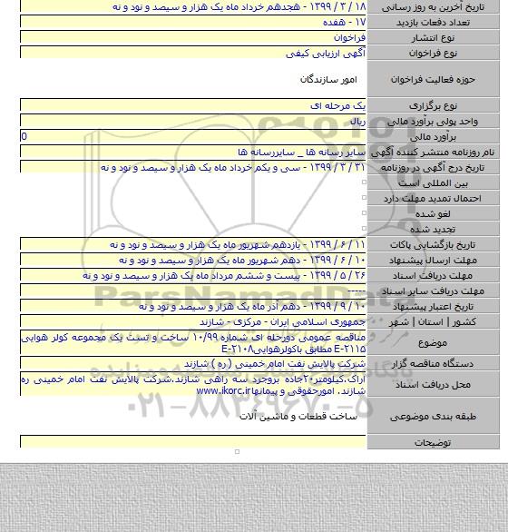 مناقصه عمومی دورحله ای شماره ۱۰/۹۹ ساخت و تست یک مجموعه کولر هوایی E-۲۱۱۵ مطابق باکولرهواییE-۲۱۰۸