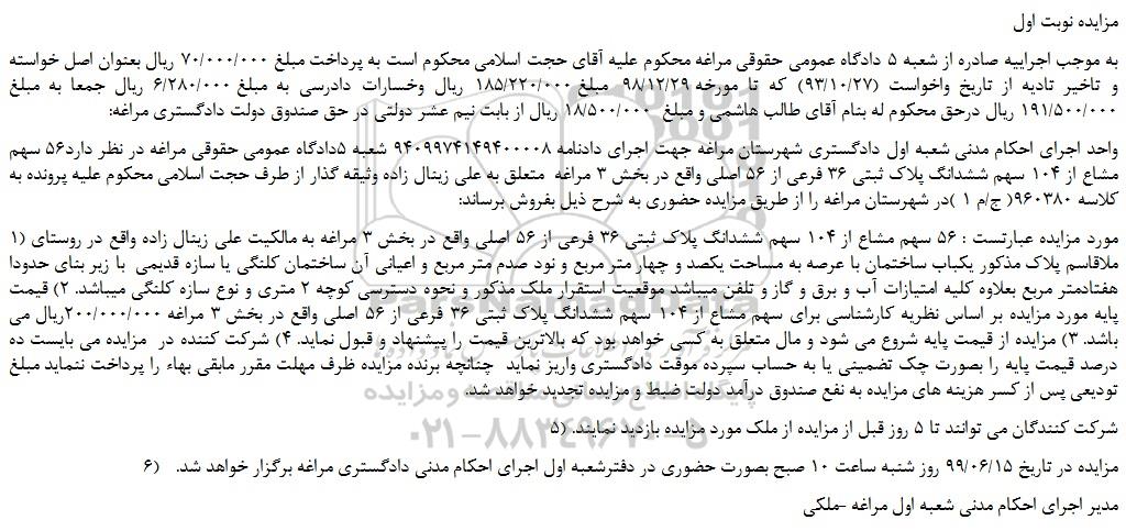 واحد اجرای احکام مدنی شعبه اول دادگستری شهرستان مراغه جهت اجرای دادنامه 9409974149400008 شعبه 5دادگاه عمومی حقوقی مراغه در نظر دارد56 سهم مشاع از 104 سهم ششدانگ پلاک ثبتی 36 فرعی از 56 اصلی واقع در بخش 3 مراغه متعلق به علی زینال زاده وثیقه گذار از طرف حجت اسلامی محکوم علیه پرونده به کلاسه 960380( ج/م 1 )در شهرستان مراغه را از طریق مزایده حضوری به شرح ذیل بفروش برساند: