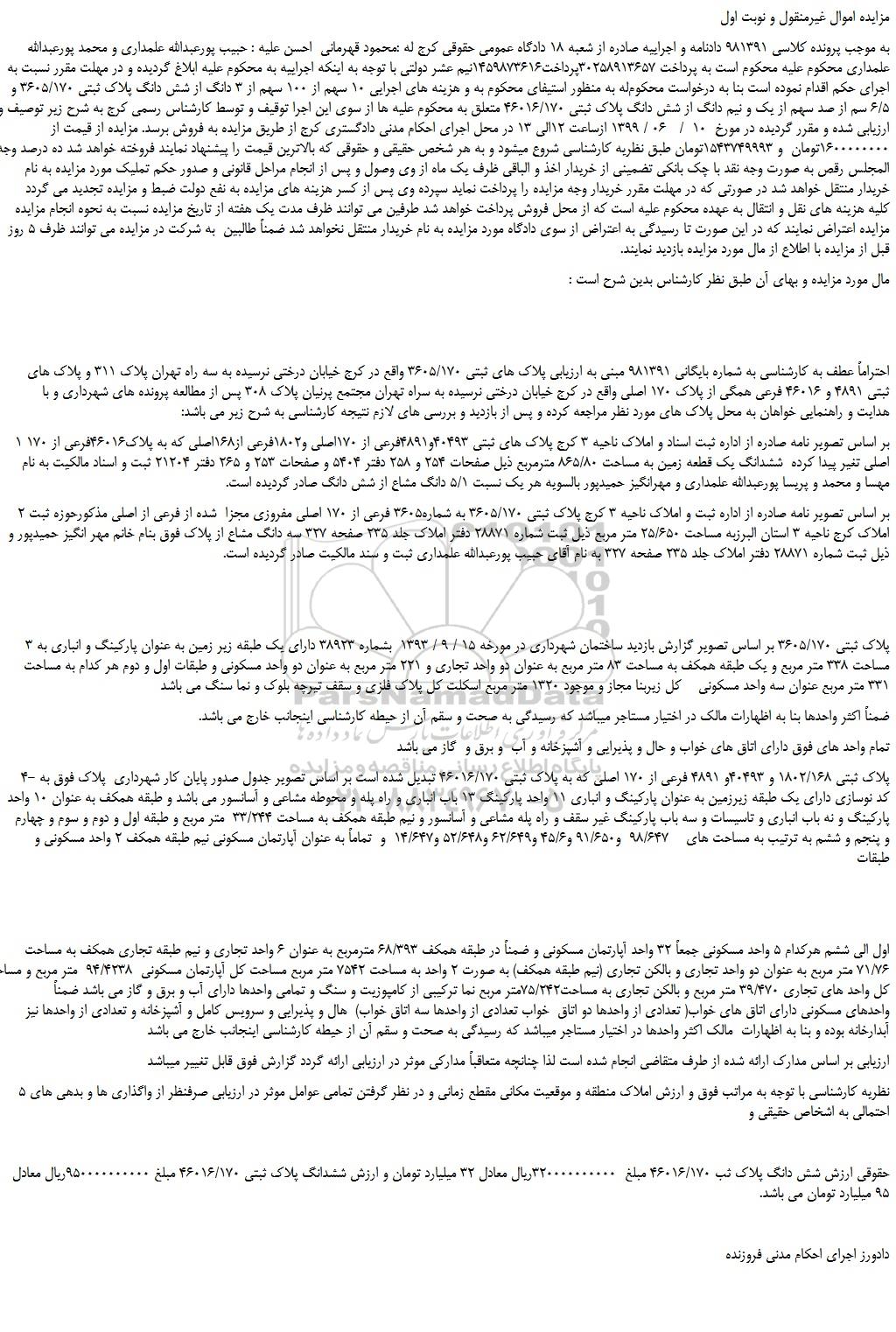 به موجب پرونده کلاسی 981391 دادنامه و اجراییه صادره از شعبه ۱۸ دادگاه عمومی حقوقی کرج له :محمود قهرمانی  احسن علیه : حبیب پورعبدالله علمداری و محمد پورعبدالله علمداری محکوم علیه محکوم است به پرداخت 30258913657پرداخت۱459873616نیم عشر دولتی با توجه به اینکه اجراییه به محکوم علیه ابلاغ گردیده و در مهلت مقرر نسبت به اجرای حکم اقدام نموده است بنا به درخواست محکوم له به منظور استیفای محکوم به و هزینه های اجرایی ۱۰ سهم از ۱۰۰ سهم از ۳ دانگ از شش دانگ پلاک ثبتی ۳۶۰۵/۱۷۰ و ۶/۵ سم از صد سهم از یک و نیم دانگ از شش دانگ پلاک ثبتی ۴۶۰۱۶/۱۷۰ متعلق به محکوم علیه ها از سوی این اجرا توقیف و توسط کارشناس رسمی کرج به شرح زیر توصیف و ارزیابی شده و مقرر گردیده در مورخ  10  /   06 / ۱۳۹۹ ازساعت ۱۲الی ۱۳ در محل اجرای احکام مدنی دادگستری کرج از طریق مزایده به فروش برسد. مزایده از قیمت از 1600000000تومان  و 1543749993تومان طبق نظریه کارشناسی شروع میشود و به هر شخص حقیقی و حقوقی که بالاترین قیمت را پیشنهاد نمایند فروخته خواهد شد ده درصد وجه مزایده فی المجلس رقص به صورت وجه نقد با چک بانکی تضمینی از خریدار اخذ و الباقی ظرف یک ماه از وی وصول و پس از انجام مراحل قانونی و صدور حکم تملیک مورد مزایده به نام خریدار منتقل خواهد شد در صورتی که در مهلت مقرر خریدار وجه مزایده را پرداخت نماید سپرده وی پس از کسر هزینه های مزایده به نفع دولت ضبط و مزایده تجدید می گردد کلیه هزینه های نقل و انتقال به عهده محکوم علیه است که از محل فروش پرداخت خواهد شد طرفین می توانند ظرف مدت یک هفته از تاریخ مزایده نسبت به نحوه انجام مزایده مزایده اعتراض نمایند که در این صورت تا رسیدگی به اعتراض از سوی دادگاه مورد مزایده به نام خریدار منتقل نخواهد شد ضمناً طالبین  به شرکت در مزایده می توانند ظرف ۵ روز قبل از مزایده با اطلاع از مال مورد مزایده بازدید نمایند.