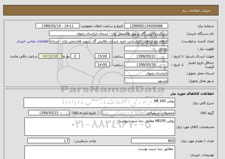 نام دستگاه خریدار:شرکت پالایش گاز شهید هاشمی نژاد - استان خراسان رضوی