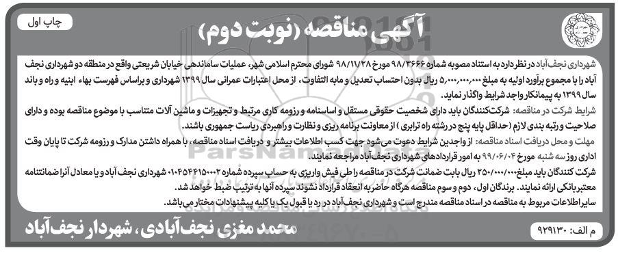 دو شهرداری نجف آباد را با مجموع برآورد اولیه به مبلغ 5.000.000.000 ریال