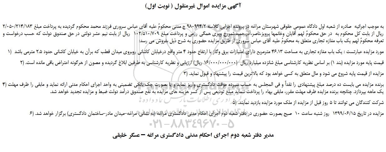 به موجب اجرائیه صادره از شعبه اول دادگاه عمومی حقوقی شهرستان مراغه در پرونده اجرایی کلاسه 980994/2 ج مدنی محکومٌ علیه آقای عباس سروری فرزند محمد محکوم گردیده به پرداخت مبلغ 2/050/214/183 ریال از بابت کل محکوم به در حق محکومٌ لهم آقایان وخانمها پرویز،ناصر،آذر،حمید،ثمررخ وپری همگی رزمی و پرداخت مبلغ 102/510/709 ریال از بابت نیم عشر دولتی در حق صندوق دولت که حسب درخواست و تعرفه محکومٌ لهم یک باب مغازه تجاری متعلق به محکومٌ علیه آقای عباس سروری از طریق مزایده حضوری به شرح ذیل بفروش می رسد: