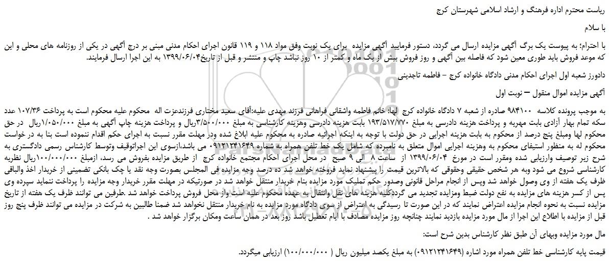 به موجب پرونده کلاسه 984100 صادره از شعبه 7 دادگاه خانواده کرج لها: خانم فاطمه واشقانی فراهانی فرزند مهدی علیه:آقای سعید مختاری فرزندعزت اله محکوم علیه محکوم است به پرداخت 107/36 عدد سکه تمام بهار آزادی بابت مهریه و پرداخت هزینه دادرسی به مبلغ 193/517/770 بابت هزینه دادرسی وهزینه کارشناسی به مبلغ 3/500/000ریال و پرداخت هزینه چاپ آگهی به مبلغ 1/050/000ریال در حق محکوم لها ومبلغ پنج درصد از محکوم به بابت هزینه اجرایی در حق دولت با توجه به اینکه اجرائیه صادره به محکوم علیه ابلاغ شده ودر مهلت مقرر نسبت به اجرای حکم اقدام ننموده است بنا به در خواست محکوم له به منظور استیفای محکوم به وهزینه اجرایی اموال متعلق به نامبرده که شامل یک خط تلفن همراه به شماره 09121241649 می باشد،ازسوی این اجراتوقیف وتوسط کارشناس رسمی دادگستری به شرح زیر توصیف وارزیابی شده ومقرر است در مورخ 1399/06/04 از ساعت 8 الی 9 صبح در محل اجرای احکام مجتمع خانواده کرج از طریق مزایده بفروش می رسد، ازمبلغ 100/000/000ریال نظریه کارشناسی شروع می شود وبه هر شخص حقیقی وحقوقی که بالاترین قیمت را پیشنهاد نماید فروخته خواهد شد ده درصد وجه مزایده فی المجلس بصورت وجه نقد یا چک بانکی تضمینی از خریدار اخذ والباقی ظرف یک هفته از وی وصول خواهد شد وپس از انجام مراحل قانونی وصدور حکم تملیک مورد مزایده بنام خریدار منتقل خواهد شد در صورتیکه در مهلت مقرر خریدار وجه مزایده را پرداخت ننماید سپرده وی پس از کسر هزینه های مزایده به نفع دولت ضبط ومزایده تجدید می گرددکلیه هزینه های نقل وانتقال به عهده محکوم علیه است واز محل فروش پرداخت خواهد شد .طرفین می توانند ظرف یک هفته از تاریخ مزایده نسبت به نحوه انجام مزایده اعتراض نمایند که در این صورت تا رسیدگی به اعتراض از سوی دادگاه مورد مزایده به نام خریدار منتقل نخواهد شد ضمنا طالبین به شرکت در مزایده می توانند ظرف پنج روز قبل از مزایده با اطلاع این اجرا از مال مورد مزایده بازدید نمایند چنانچه روز مزایده مصادف با ایام تعطیل باشد روز بعد در همان ساعت ومکان برگزار خواهد شد .