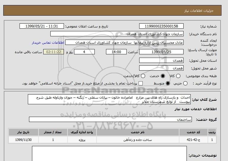 شرح کلی نیاز: احداث و بازسازی راه های بین مزارع امامزاده خاتون – بیاتان سفلی – زنگنه – جوزان وازناوله طبق شرح پیوست از توابع شهرستان ملایر