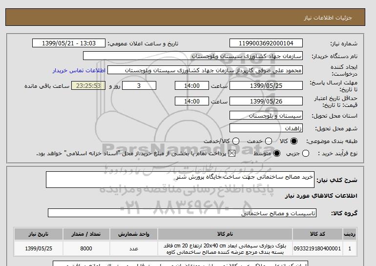 شرح کلی نیاز: خرید مصالح ساختمانی جهت ساخت جایگاه پرورش شتر