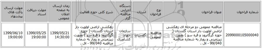 | 2099000105000040 | مناقصه عمومی دو مرحله ای زهکشی اراضی اولویت دار استان گلستان ( حوزه گرگانرود و قره سو ) بصورت زیرزمینی و روباز به شماره مناقصه 99/040 - اق . | مناقصه عمومی | گلستان | سازمان جهاد کشاورزی | زهکشی اراضی اولویت دار استان گلستان ( حوزه گرگانرود و قره سو ) بصورت زیرزمینی و روباز به شماره مناقصه 99/040 - اق . | 1399/05/21 14:30:00 | 1399/05/25 19:00:00 | 1399/06/10 19:00:00 |