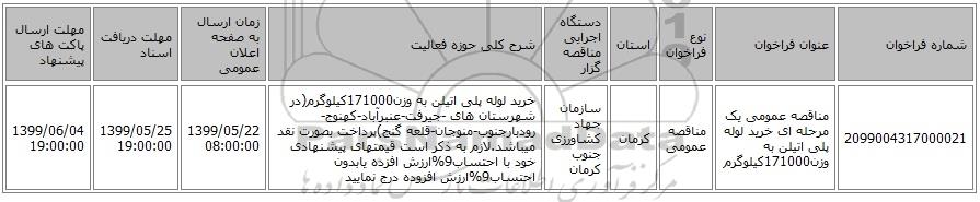 | 2099004317000021 | مناقصه عمومی یک مرحله ای خرید لوله پلی اتیلن به وزن171000کیلوگرم | مناقصه عمومی | کرمان | سازمان جهاد کشاورزی جنوب کرمان | خرید لوله پلی اتیلن به وزن171000کیلوگرم(در شهرستان های -جیرفت-عنبرآباد-کهنوج-رودبارجنوب-منوجان-قلعه گنج)پرداخت بصورت نقد میباشد.لازم به ذکر است قیمتهای پیشنهادی خود با احتساب9%ارزش افزده یابدون احتساب9%ارزش افزوده درج نمایید | 1399/05/22 08:00:00 | 1399/05/25 19:00:00 | 1399/06/04 19:00:00 |