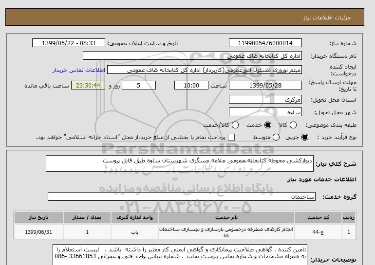 شرح کلی نیاز: دیوارکشی محوطه کتابخانه عمومی علامه عسگری شهرستان ساوه طبق فایل پیوست