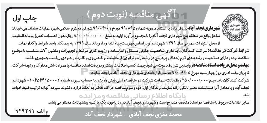 شهرداری نجف آباد در نظر دارد به استناد مصوبه شماره 99/895 مورخ 99.4.1 شورای محترم اسلامی شهر، عملیات ساماندهی خیابان ساحل واقع در منطقه پنج شهرداری نجف آباد را با مجموع برآورد اولیه به مبلغ 5.000.000.000 ریال بدون احتساب تعدیل و مابه التفاوت از محل اعتبارات عمرانی سال 1399 شهرداری و بر اساس فهرست بها ابنیه و راه و باند سال 1399 به پیمانکار واجد شرایط واگذار نماید.