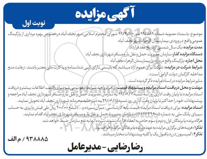 موضوع: در خصوص بهره برداری از پارکینگ عمومی واقع در ورودی بیمارستان الزهرا شهر نجف آباد