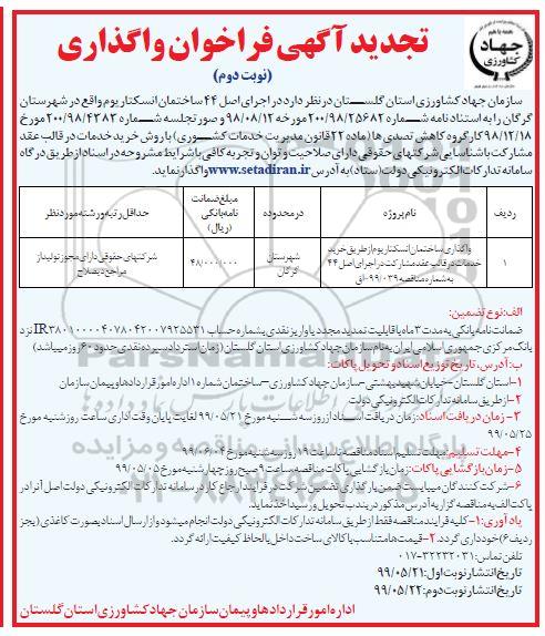 سازمان جهاد کشاورزی استان گلستان در نظر دارد ساختمان انسکتاریوم واقع در شهرستان گرگان را به استناد نامه شماره 25682/98/200 مورخه 98.8.12 و صورتجلسه شماره 4383/98/200 مورخ 98/12/18 کارگروه کاهش تصدی ها ماده 22 قانون مدیریت خدمات کشوری با روش خرید خدمات در قالب عقد مشارکت با شناسایی شرکت های حقوقی دارای صلاحیت و توان و تجربه کافی با شرایط مشروحه در اسناد از طریق درگاه سامانه تدارکات الکترونیکی دولت ستاد به آدرس سایت ستاد ایران واگذار نماید .