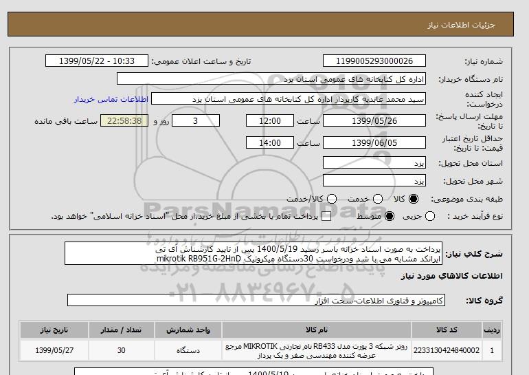استعلام پرداخت به صورت اسناد خزانه باسر رسید 1400/5/19 پس از تایید کارشناش آی تی ایرانکد مشابه می با شد ودرخواست 30دستگاه میکروتیک mikrotik RB951G-2HnD, استعلام پرداخت به صورت اسناد خزانه باسر رسید 1400/5/19 پس از تایید کارشناش آی تی ایرانکد مشابه می با شد ودرخواست 30دستگاه میکروتیک mikrotik RB951G-2HnD