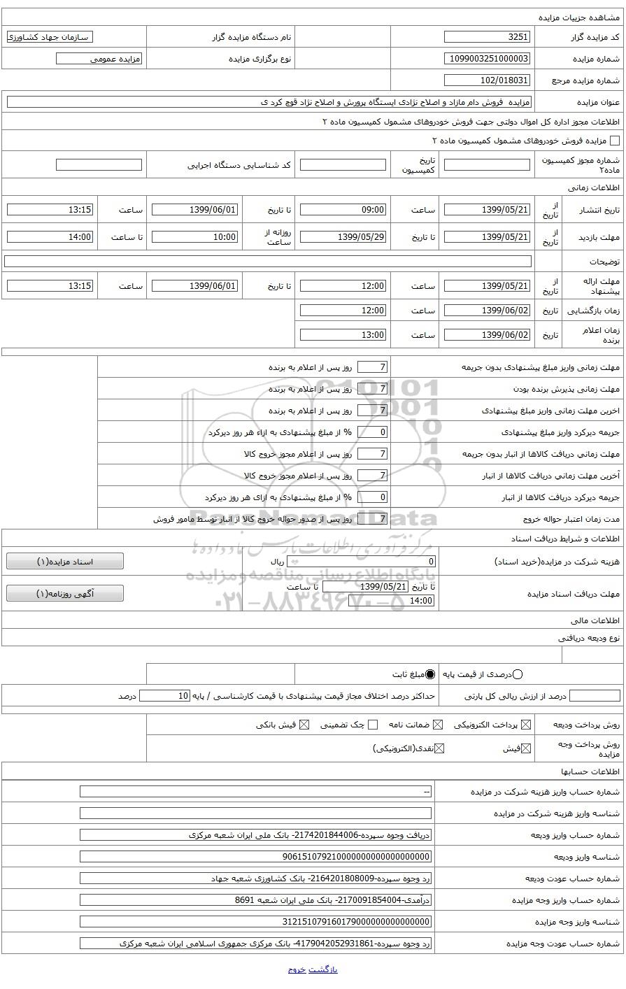 | کد مزایده گزار | 3251 | نام دستگاه مزایده گزار | سازمان جهاد کشاورزی | |