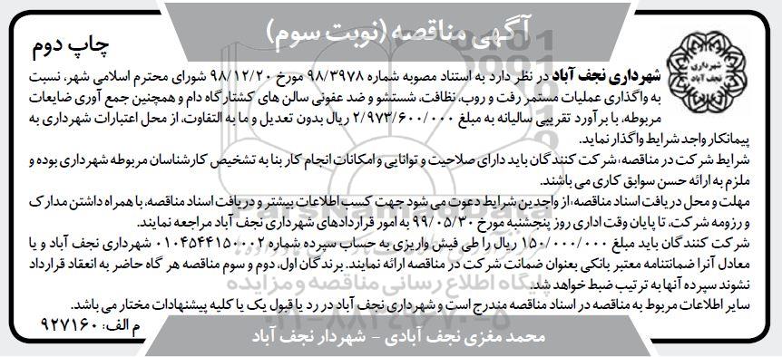 شهرداری نجف آباد در نظر دارد به استناد مصوبه شماره 98/3978 مورخ 98.12.20 شورای محترم اسلامی شهر، نسبت به واگذاری عملیات مستمر رفت و روب، نظافت، شستشو و ضدعفونی سالن های کشتارگاه دام و همچنین جمع آوری ضایعات مربوطه، با برآورد تقریبی سالیانه به مبلغ 2.973.600.000 ریال بدون تعدیل و مابه التفاوت، از محل اعتبارات شهرداری به پیمانکار واجد شرایط واگذار نماید.