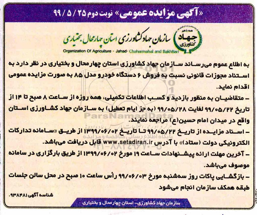 سازمان جهاد کشاورزی استان چهارمحال و بختیاری در نظر دارد به استناد مجوزات قانونی نسبت به فروش 6 دستگاه خودرو مدل 85 به صورت مزایده عمومی اقدام نماید.