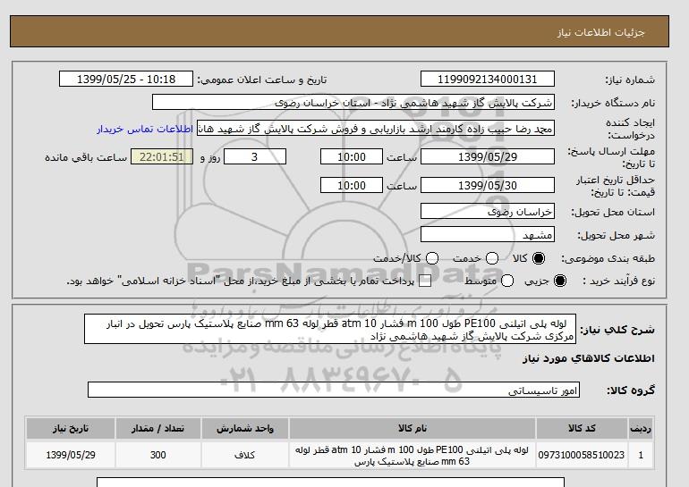 نام دستگاه خریدار:شرکت پالایش گاز شهید هاشمی نژاد - استان خراسان رضوی