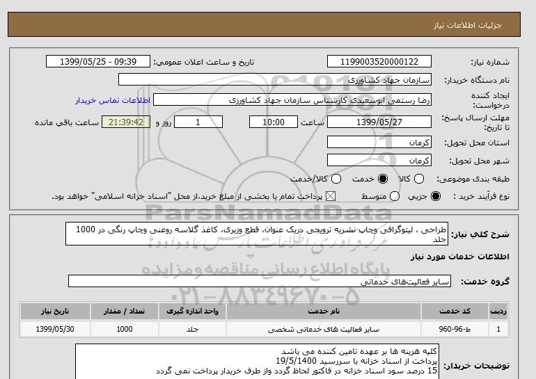شرح کلی نیاز: طراحی ، لیتوگرافی وچاپ نشریه ترویجی دریک عنوان، قطع وزیری، کاغذ گلاسه روغنی وچاپ رنگی در 1000 جلد