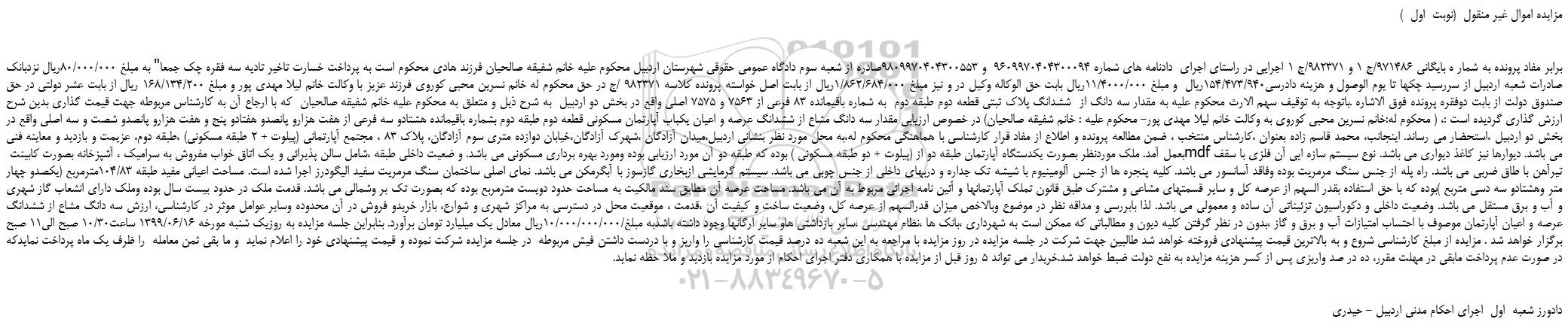 برابر مفاد پرونده به شمار ه بایگانی 971486/ج 1 و 982371/ج 1 اجرایی در راستای اجرای دادنامه های شماره 9609970404300094 و 9809970404300553صادره از شعبه سوم دادگاه عمومی حقوقی شهرستان اردبیل محکوم علیه خانم شفیقه صالحیان فرزند هادی محکوم است به پرداخت خسارت تاخیر تادیه سه فقره چک جمعا" به مبلغ 80/000/000ریال نزدبانک صادرات شعبه اردبیل از سررسید چکها تا یوم الوصول و هزینه دادرسی154/473/940ریال و مبلغ 11/4000/000ریال بابت حق الوکاله وکیل در و نیز مبلغ 1/862/684/000ریال از بابت اصل خواسته پرونده کلاسه 982371 /ج در حق محکوم له خانم نسرین محبی کوروی فرزند عزیز با وکالت خانم لیلا مهدی پور و مبلغ 168/134/200 ریال از بابت عشر دولتی در حق صندوق دولت از بابت دوفقره پرونده فوق الاشاره .باتوجه به توقیف سهم الارث محکوم علیه به مقدار سه دانگ از ششدانگ پلاک ثبتی قطعه دوم طبقه دوم به شماره باقیمانده 83 فرعی از 7563 و 7575 اصلی واقع در بخش دو اردبیل به شرح ذیل و متعلق به محکوم علیه خانم شفیقه صالحیان که با ارجاع آن به کارشناس مربوطه جهت قیمت گذاری بدین شرح ارزش گذاری گردیده است :، ( محکوم له:خانم نسرین محبی کوروی به وکالت خانم لیلا مهدی پور- محکوم علیه : خانم شفیقه صالحیان) در خصوص ارزیابی مقدار سه دانگ مشاع از ششدانگ عرصه و اعیان یکباب آپارتمان مسکونی قطعه دوم طبقه دوم بشماره باقیمانده هشتادو سه فرعی از هفت هزارو پانصدو هفتادو پنج و هفت هزارو پانصدو شصت و سه اصلی واقع در بخش دو اردبیل ،استحضار می رساند. اینجانب، محمد قاسم زاده بعنوان ،کارشناس منتخب ، ضمن مطالعه پرونده و اطلاع از مفاد قرار کارشناسی با هماهنگی محکوم له،به محل مورد نظر بنشانی اردبیل،میدان آزادگان ،شهرک آزادگان،خیابان دوازده متری سوم آزادگان، پلاک 83 ، مجتمع آپارتمانی (پیلوت + 2 طبقه مسکونی) ،طبقه دوم، عزیمت و بازدید و معاینه فنی بعمل آمد. ملک موردنظر بصورت یکدستگاه آپارتمان طبقه دو از (پیلوت + دو طبقه مسکونی ) بوده که طبقه دو آن مورد ارزیابی بوده ومورد بهره برداری مسکونی می باشد. و ضعیت داخلی طبقه ،شامل سالن پذیرائی و یک اتاق خواب مفروش به سرامیک ، آشپزخانه بصورت کابینت mdf می باشد. دیوارها نیز کاغذ دیواری می باشد. نوع سیستم سازه ایی آن فلزی با سقف تیرآهن با طاق ضربی می باشد. راه پله از جنس سنگ مرمریت بوده وفاقد آسانسور می باشد. کلیه پنجره ها از جنس آلومینیوم با شیشه تک جداره و دربهای داخلی از جنس چوبی می باشد. سیستم گرمایشی ازبخاری گازسوز با آبگرمکن می باشد. نمای اصلی ساختمان سنگ مرمریت سفید الیگودرز اجرا شده است. مساحت اعیانی مفید طبقه 104/83مترمربع (یکصدو چهار متر وهشتادو سه دسی متربع )بوده که با حق استفاده بقدر السهم از عرصه کل و سایر قسمتهای مشاعی و مشترک طبق قانون تملک آپارتمانها و آئین نامه اجرائی مربوط به آن می باشد. مساحت عرصه آن مطابق سند مالکیت به مساحت حدود دویست مترمربع بوده که بصورت تک بر وشمالی می باشد. قدمت ملک در حدود بیست سال بوده وملک دارای انشعاب گاز شهری و آب و برق مستقل می باشد. وضعیت داخلی و دکوراسیون تزئیناتی آن ساده و معمولی می باشد. لذا بابررسی و مداقه نظر در موضوع وبالاخص میزان قدرالسهم از عرصه کل، وضعیت ساخت و کیفیت آن ،قدمت ، موقعیت محل در دسترسی به مراکز شهری و شوارع، بازار خریدو فروش در آن محدوده وسایر عوامل موثر در کارشناسی، ارزش سه دانگ مشاع از ششدانگ عرصه و اعیان آپارتمان موصوف با احتساب امتیازات آب و برق و گاز ،بدون در نظر گرفتن کلیه دیون و مطالباتی که ممکن است به شهرداری ،بانک ها ،نظام مهندسی ،سایر بازداشتی هاو سایر ارگانها وجود داشته باشدبه مبلغ/10/000/000/000ریال معادل یک میلیارد تومان برآورد. بنابراین جلسه مزایده به روزیک شنبه مورخه 1399/06/16 ساعت10/30 صبح الی11 صبح برگزار خواهد شد . مزایده از مبلغ کارشناسی شروع و به بالاترین قیمت پیشنهادی فروخته خواهد شد طالبین جهت شرکت در جلسه مزایده در روز مزایده با مراجعه به این شعبه ده درصد قیمت کارشناسی را واریز و با دردست داشتن فیش مرب