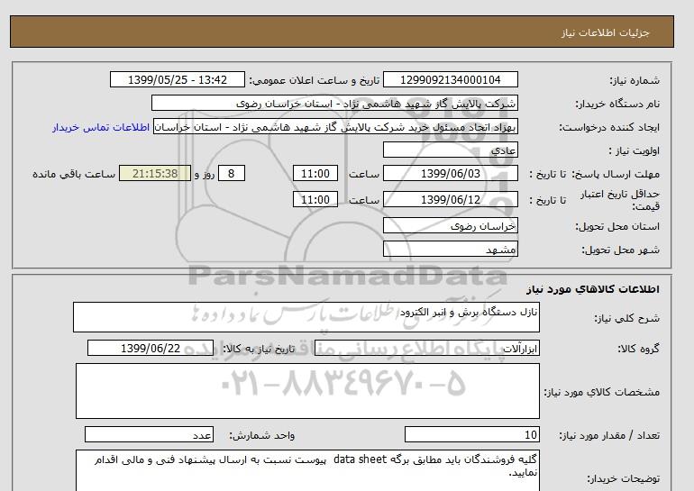 نام دستگاه خریدار:شرکت پالایش گاز شهید هاشمی نژاد - استان خراسان رضوی