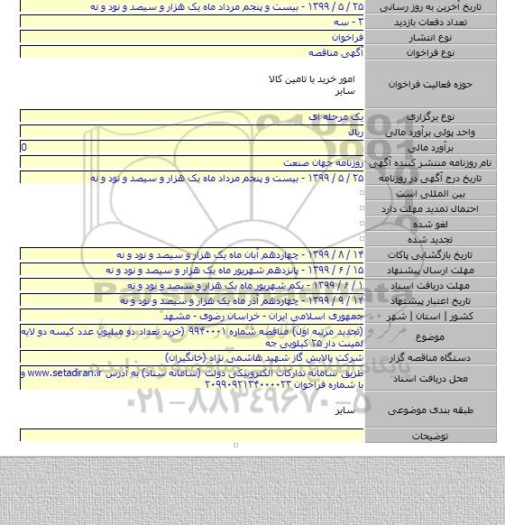 (تجدید مرتبه اول) مناقصه شماره ۹۹۴۰۰۰۱ (خرید تعداد دو میلیون عدد کیسه دو لایه لمینت دار ۲۵ کیلویی جه