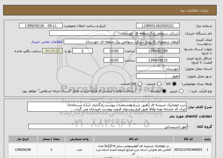 شرح کلی نیاز: درب اتوماتیک شیشه ای (طبق شرح ومشخصات پیوست بارگذاری شده درسامانه)