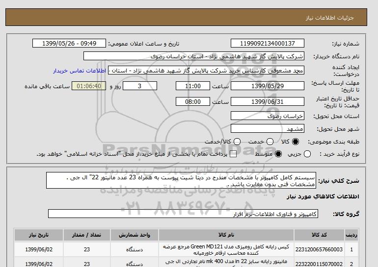 شرح کلی نیاز: سیستم کامل کامپیوتر با مشخصات مندرج در دیتا شیت پیوست به همراه 23 عدد مانیتور 22" ال جی .
