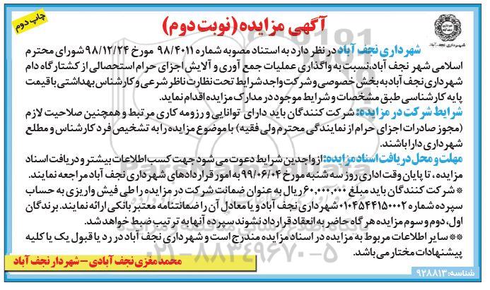 شهرداری نجف آباد درنظردارد نسبت به واگذاری عملیات جمع آوری و آلایش اجزای حرام استحصالی از کشتارگاه دام شهرداری نجف آباد به بخش خصوصی و شرکت واجد شرایط تحت نظارت ناظر شرعی و کارشناسی بهداشتی با قیمت پایه کارشناسی طبق مشخصات و شرایط موجود در مدارک مزایده اقدام نمایند