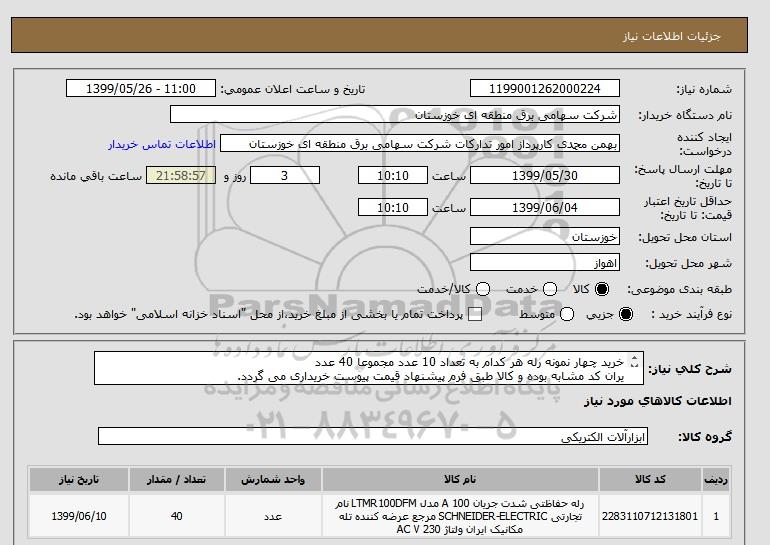 شرح کلی نیاز: خرید چهار نمونه رله هر کدام به تعداد 10 عدد مجموعا 40 عدد یران کد مشابه بوده و کالا طبق فرم پیشنهاد قیمت پیوست خریداری می گردد.