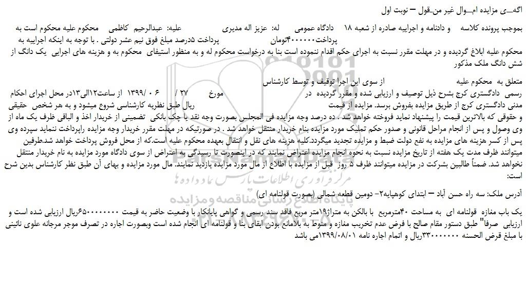 بموجب پرونده کلاسه و دادنامه و اجراییه صادره از شعبه 18 دادگاه عمومی له: عزیز اله مدیری علیه: عبدالرحیم کاظمی محکوم علیه محکوم است به پرداخت4000000تومان پرداخت 5درصد مبلغ فوق نیم عشر دولتی . با توجه به اینکه اجراییه به محکوم علیه ابلاغ گردیده و در مهلت مقرر نسبت به اجرای حکم اقدام ننموده است بنا به درخواست محکوم له و به منظور استیفای محکوم به و هزینه های اجرایی یک دانگ از شش دانگ ملک مذکور متعلق به محکوم علیه از سوی این اجرا توقیف و توسط کارشناس رسمی دادگستری کرج بشرح ذیل توصیف و ارزیابی شده و مقرر گردیده در مورخ 27 / 6 0 /1399 از ساعت12الی13در محل اجرای احکام مدنی دادگستری کرج از طریق مزایده بفروش برسد. مزایده از قیمت ریال طبق نظریه کارشناسی شروع میشود و به هر شخص حقیقی و حقوقی که بالاترین قیمت را پیشنهاد نماید فروخته خواهد شد . ده درصد وجه مزایده فی المجلس بصورت وجه نقد یا چک بانکی تضمینی از خریدار اخذ و الباقی ظرف یک ماه از وی وصول و پس از انجام مراحل قانونی و صدور حکم تملیک مورد مزایده بنام خریدار منتقل خواهد شد . در صورتیکه در مهلت مقرر خریدار وجه مزایده راپرداخت ننماید سپرده وی پس از کسر هزینه های مزایده به نفع دولت ضبط و مزایده تجدید میگردد.کلیه هزینه های نقل و انتقال بعهده محکوم علیه است.که از محل فروش پرداخت خواهد شد.طرفین میتوانند ظرف مدت یک هفته از تاریخ مزایده نسبت به نحوه انجام مزایده اعتراض نمایند که در اینصورت تا رسیدگی به اعتراض از سوی دادگاه مورد مزایده به نام خریدار منتقل نخواهد شد. ضمناً طالبین بشرکت در مزایده میتوانند ظرف 5 روز قبل از مزایده با اطلاع از مال مورد مزایده بازدید نمایند. مال مورد مزایده و بهای آن طبق نظر کارشناس بدین شرح است: