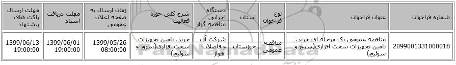 | 2099001331000018 | مناقصه عمومی یک مرحله ای خرید، تامین تجهیزات سخت افزاری(سرور و سوئیچ) | مناقصه عمومی | خوزستان | شرکت آب و فاضلاب اهواز | خرید، تامین تجهیزات سخت افزاری(سرور و سوئیچ) | 1399/05/26 08:00:00 | 1399/06/01 19:00:00 | 1399/06/13 19:00:00 |