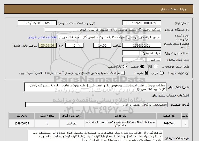 شرح کلی نیاز: عملیات مربوط به نصب استیل بلت روتوفرمر E و تعمیر استیل بلت روتوفرمرهایA ، D و C ...شرکت پالایش گاز شهید هاشمی نژاد