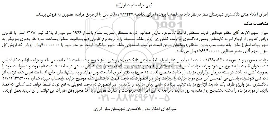 اجرای احکام مدنی دادگستری شهرستان سقز در نظر دارد در رابطه با پرونده اجرائی بکلاسه 981442 ، ملک ذیل را از طریق مزایده حضوری به فروش برساند.