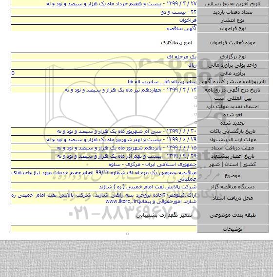 مناقبصه عمومی یک مرحله ای شماره ۹۹/۱۲ انجام حجم خدمات مورد نیاز واحدهای عملیاتی