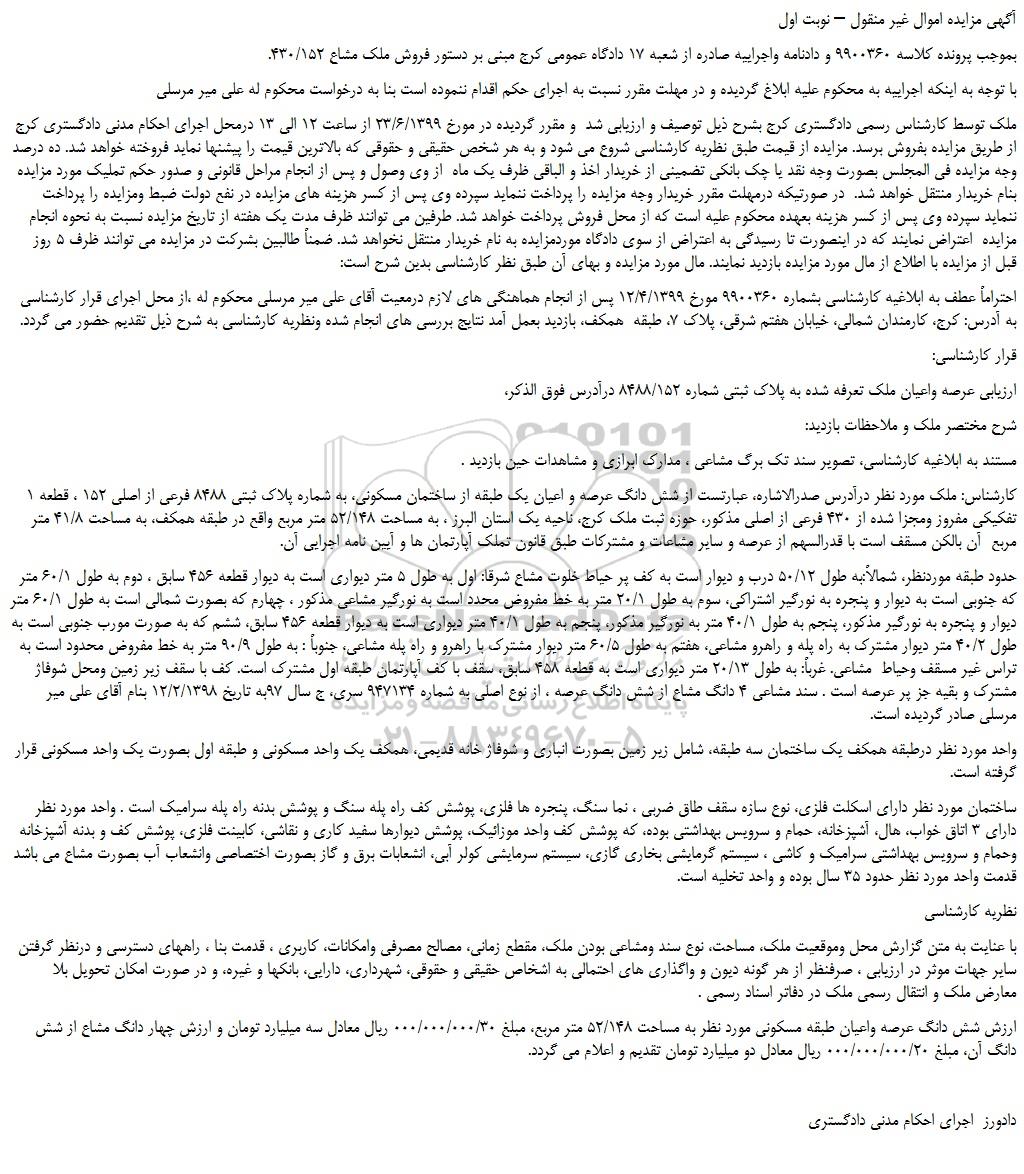 بموجب پرونده کلاسه 9900360 و دادنامه واجراییه صادره از شعبه 17 دادگاه عمومی کرج مبنی بر دستور فروش ملک مشاع 430/152.