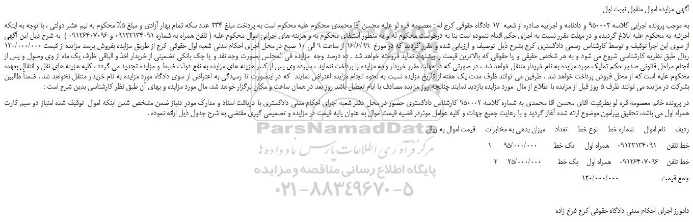 به موجب پرونده اجرایی کلاسه 950002 و دادنامه و اجراییه صادره از شعبه  17 دادگاه حقوقی کرج له : معصومه قره لو علیه محسن آقا محمدی محکوم علیه محکوم است به پرداخت مبلغ 234 عدد سکه تمام بهار آزادی و مبلغ 5% محکوم به نیم عشر دولتی ، با توجه به اینکه اجرائیه به محکوم علیه ابلاغ گردیده و در مهلت مقرر نسبت به اجرای حکم اقدام ننموده است بنا به درخواست محکوم له و به منظور استیفای محکوم به و هزینه های اجرایی اموال محکوم علیه ( تلفن همراه به شماره 09122134091 و 09126407096 )  به شرح ذیل این آگهی از سوی این اجرا توقیف و توسط کارشناس رسمی دادگستری کرج بشرح ذیل توصیف و ارزیابی شده و مقرر گردید که در مورخ  16/6/99 از ساعت 9 الی 10 صبح در محل اجرای احکام مدنی شعبه اول حقوقی کرج از طریق مزایده بفروش برسد مزایده از قیمت 120/000/000 ریال طبق نظریه کارشناسی شروع می شود و به هر شخص حقیقی و یا حقوقی که بالاترین قیمت را پیشنهاد نماید فروخته خواهد شد . ده درصد وجه  مزایده فی المجلس بصورت وجه نقد و یا چک بانکی تضمینی از خریدار اخذ و الباقی ظرف یک ماه از وی وصول و پس از انجام مراحل قانونی صدور حکم تملیک مورد مزایده به نام خریدار منتقل خواهد شد . در صورتی که در مهلت مقرر خریدار وجه مزایده را پرداخت ننماید ، سپرده وی پس از کسر هزینه های مزایده به نفع دولت ضبط و مزایده تجدید می گردد ، کلیه هزینه های نقل و انتقال بعهده محکوم علیه است که از محل فروش پرداخت خواهد شد . طرفین می توانند ظرف مدت یک هفته از تاریخ مزایده نسبت به نحوه انجام مزایده اعتراض نمایند  که در اینصورت تا رسیدگی به اعتراض از سوی دادگاه مورد مزایده به نام خریدار منتقل نخواهد شد . ضمناً طالبین بشرکت در مزایده می توانند ظرف 5 روز قبل از مزایده با اطلاع از مال  مورد مزایده بازدید نمایند چنانجه روز مزایده مصادف با ایام تعطیل باشد روز بعد در همان ساعت و مکان برگزار خواهد شد. مال مورد مزایده و بهای آن طبق نظر کارشناسی بدین شرح است :