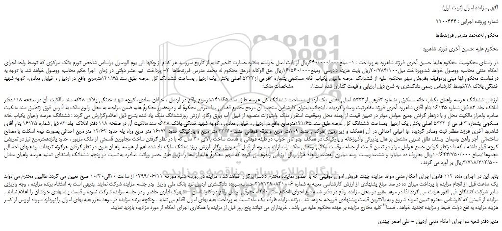 در راستای محکومیت محکوم علیه: حسین آخری فرزند شاهرود به پرداخت : 1- مبلغ640/000/000ریال از بابت اصل خواسته بعلاوه خسارت تاخیر تادیه از تاریخ سررسید هر کدام از چکها الی یوم الوصول براساس شاخص تورم بانک مرکزی که توسط واحد اجرای احکام مدنی محاسبه ووصول خواهد شد.وپرداخت مبل20/784/100ریال بابت هزینه دادرسی  ومبلغ16/560/000ریال حق الوکاله درحق محکوم له محمد مدرس فرزندطاها  2- پرداخت  نیم عشر دولتی در زمان  اجرا حکم محاسبه ووصول خواهد شد. با توجه به درخواست محکوم لها مبنی برتوقیف وفروش سهم محکوم علیه از ششدانگ عرصه واعیان یکباب خانه مسکونی بشماره 3فرعی از5332 اصلی بخش یک اردبیل بمساحت ششدانگ کل عرصه طبق سند 141/65مترمربع واقع در اردبیل ، خیابان معادی، کوچه شهید خدنگی پلاک 28،توسط کارشناس رسمی دادگستری به شرح ذیل ارزیابی و قیمت گذاری شده است./.            مشخصات ملک: