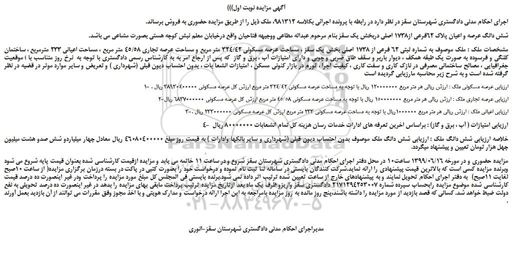مزایده، مزایده فروش شش دانگ عرصه و اعیان پلاک 62فرعی از1738 اصلی