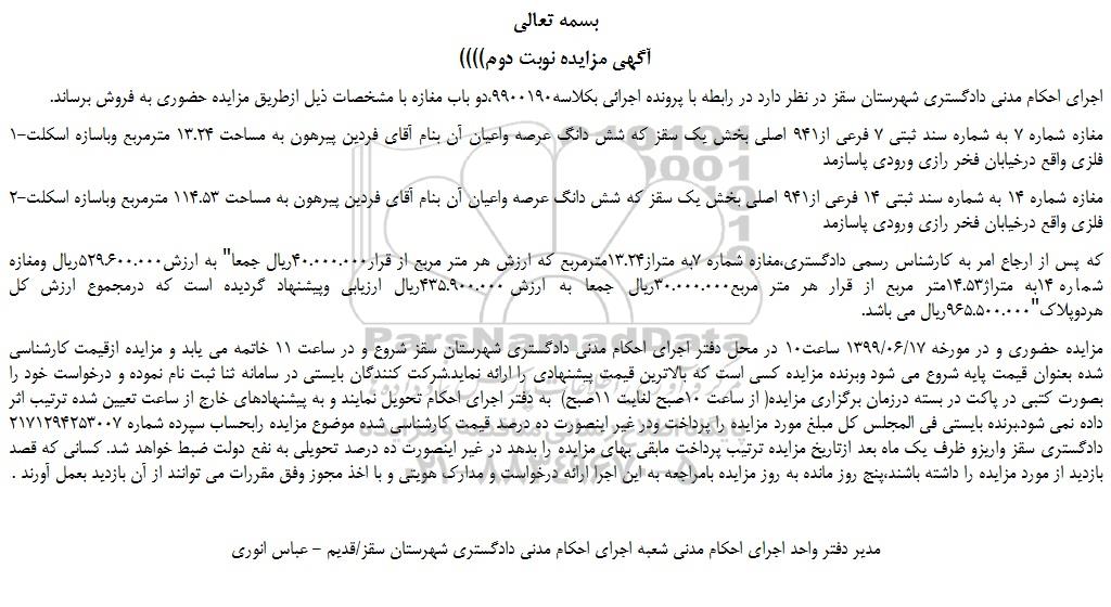 مزایده حضوری و در مورخه 1399/06/17 ساعت10 در محل دفتر اجرای احکام مدنی دادگستری شهرستان سقز شروع و در ساعت 11 خاتمه می یابد و مزایده ازقیمت کارشناسی شده بعنوان قیمت پایه شروع می شود وبرنده مزایده کسی است که بالاترین قیمت پیشنهادی را ارائه نماید.شرکت کنندگان بایستی در سامانه ثنا ثبت نام نموده و درخواست خود را بصورت کتبی در پاکت در بسته درزمان برگزاری مزایده( از ساعت 10صبح لغایت 11صبح) به دفتر اجرای احکام تحویل نمایند و به پیشنهادهای خارج از ساعت تعیین شده ترتیب اثر داده نمی شود.برنده بایستی فی المجلس کل مبلغ مورد مزایده را پرداخت ودر غیر اینصورت ده درصد قیمت کارشناسی شده موضوع مزایده رابحساب سپرده شماره 2171294253007 دادگستری سقز واریزو ظرف یک ماه بعد ازتاریخ مزایده ترتیب پرداخت مابقی بهای مزایده را بدهد در غیر اینصورت ده درصد تحویلی به نفع دولت ضبط خواهد شد. کسانی که قصد بازدید از مورد مزایده را داشته باشند،پنج روز مانده به روز مزایده بامراجعه به این اجرا ارائه درخواست و مدارک هویتی و با اخذ مجوز وفق مقررات می توانند از آن بازدید بعمل آورند