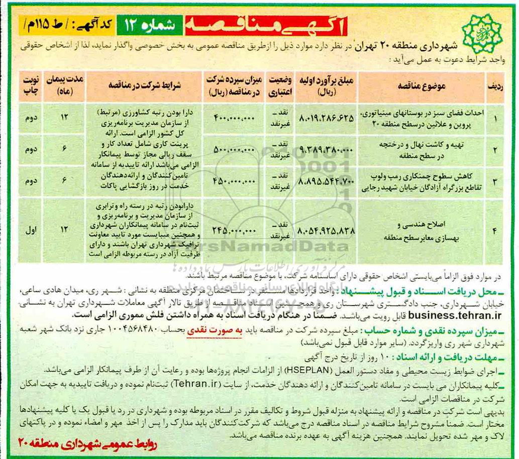 شهرداری منطقه 20 تهران در نظر دارد موارد ذیل را از طریق مناقصه عمومی به بخش خصوصی واگذار نماید. لذا از اشخاص حقوقی واجد شرایط دعوت به عمل می آید: