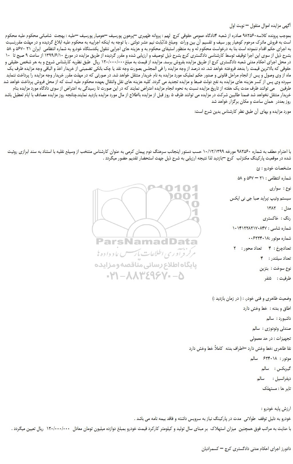 بموجب پرونده کلاسه982560 صادره از شعبه 4دادگاه عمومی حقوقی کرج  لهم : پروانه ظهیری –پرهون پورسیف –هومیار پورسیف –علیه : بهجت  شامبانی محکوم علیه محکوم است به فروش ماترک مرحوم کوهیار پور سیف و تقسیم آن بین وراث  ومبلغ 5%بابت نیم عشر دولتی . با توجه به اینکه اجراییه به محکوم علیه ابلاغ گردیده و در مهلت مقررنسبت به اجرای حکم اقدام ننموده است بنا به درخواست محکوم له و به منظور استیفای محکوم به و هزینه های اجرایی ننقول یکدستگاه خودرو به شماره انتظامی  ایران 21 -567 و 58  بشرح ذیل از سوی این اجرا توقیف توسط کارشناسی دادگستری کرج بشرح ذیل توصیف و ارزیابی شده و مقرر گردیده از طریق مزایده در مورخ 1399/6/10 از ساعت 9 صبح تا  10 در محل اجرای احکام مدنی شعبه دادگستری کرج از طریق مزایده بفروش برسد. مزایده از قیمت به مبلغ120/000/000 ریال  طبق نظریه کارشناس شروع و به هر شخص حقیقی و حقوقی که بالاترین قیمت را بدهد فروخته خواهد شد. ده درصد از وجه مزایده را فی المجلس بصورت وجه نقد یا چک بانکی تضمینی از خریدار اخذ و الباقی وجه مزایده ظرف یک ماه از وی وصول و پس از انجام مراحل قانونی و صدور حکم تملیک مورد مزایده به نام خریدار منتقل خواهد شد. در صورتی که در مهلت مقرر خریدار وجه مزایده را پرداخت ننماید سپرده وی پس از کسر هزینه های مزایده به نفع دولت ضبط و مزایده تجدید می گردد. کلیه هزینه های نقل وانتقال بعهده محکوم علیه است که از محل فروش پرداخت خواهد شد طرفین    می توانند ظرف مدت یک هفته از تاریخ مزایده نسبت به نحوه انجام مزایده اعتراض نمایند که در این صورت تا رسیدگی به اعتراض از سوی دادگاه مورد مزایده بنام خریدار منتقل نخواهد شد ضمنا طالبین شرکت در مزایده می توانند ظرف 5 روز قبل از مزایده بااطلاع از مال مورد مزایده بازدید نمایند.چنانجه روز مزایده مصادف با ایام تعطیل باشد روز بعددر  همان ساعت و مکان برگزار خواهد شد