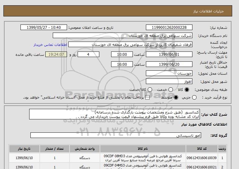 شرح کلی نیاز: کندانسور (طبق شرح ومشخصات پیوست بارگذاری شده درسامانه) ایران کد مشابه بوده وکالا طبق فرم پیشنهاد قیمت پیوست خریداری می گردد .