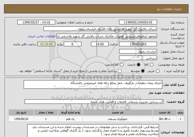 شرح کلی نیاز: اجرای پیمان تنظیفات، بارگیری ،حمل ودفع زباله های غیرصنعتی پالایشگاه
