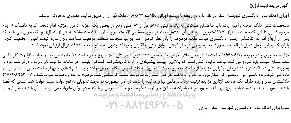 اجرای احکام مدنی دادگستری شهرستان سقز در نظر دارد در رابطه با پرونده اجرائی بکلاسه 980622 ، ملک ذیل را از طریق مزایده حضوری به فروش برساند.