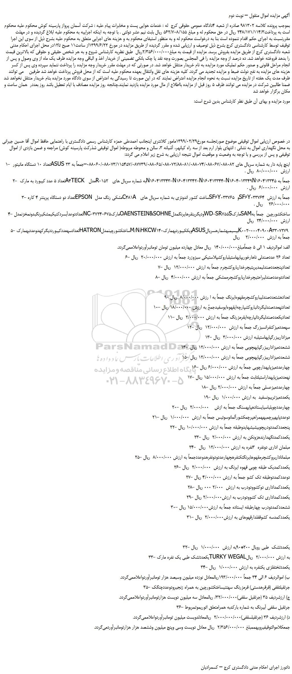 بموجب پرونده کلاسه 981302 صادره از شعبه 4دادگاه عمومی حقوقی کرج  له : خدمات هوایی پست و مخابرات پیام علیه : شرکت آسمان پرواز پارسینه کوش محکوم علیه محکوم است به پرداخت248/171/114/3 ریال در حق محکوم له و مبلغ 562/708/155 ریال بابت نیم عشر دولتی . با توجه به اینکه اجراییه به محکوم علیه ابلاغ گردیده و در مهلت مقررنسبت به اجرای حکم اقدام ننموده است بنا به درخواست محکوم له و به منظور استیفای محکوم به و هزینه های اجرایی متعلق به محکوم علیه بشرح ذیل از سوی این اجرا توقیف توسط کارشناسی دادگستری کرج بشرح ذیل توصیف و ارزیابی شده و مقرر گردیده از طریق مزایده در مورخ 1399/6/22از ساعت11 صبح تا12در محل اجرای احکام مدنی شعبه دادگستری کرج از طریق مزایده بفروش برسد. مزایده از قیمت به مبلغ2/356/000/000ریال  طبق نظریه کارشناس شروع و به هر شخص حقیقی و حقوقی که بالاترین قیمت را بدهد فروخته خواهد شد. ده درصد از وجه مزایده را فی المجلس بصورت وجه نقد یا چک بانکی تضمینی از خریدار اخذ و الباقی وجه مزایده ظرف یک ماه از وی وصول و پس از انجام مراحل قانونی و صدور حکم تملیک مورد مزایده به نام خریدار منتقل خواهد شد. در صورتی که در مهلت مقرر خریدار وجه مزایده را پرداخت ننماید سپرده وی پس از کسر هزینه های مزایده به نفع دولت ضبط و مزایده تجدید می گردد. کلیه هزینه های نقل وانتقال بعهده محکوم علیه است که از محل فروش پرداخت خواهد شد طرفین    می توانند ظرف مدت یک هفته از تاریخ مزایده نسبت به نحوه انجام مزایده اعتراض نمایند که در این صورت تا رسیدگی به اعتراض از سوی دادگاه مورد مزایده بنام خریدار منتقل نخواهد شد ضمنا طالبین شرکت در مزایده می توانند ظرف 5 روز قبل از مزایده بااطلاع از مال مورد مزایده بازدید نمایند.چنانجه روز مزایده مصادف با ایام تعطیل باشد روز بعددر  همان ساعت و مکان برگزار خواهد شد