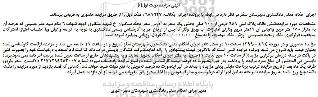 اجرای احکام مدنی دادگستری شهرستان سقز در نظر دارد در رابطه با پرونده اجرائی بکلاسه 981627 ، ملک ذیل را از طریق مزایده حضوری به فروش برساند.