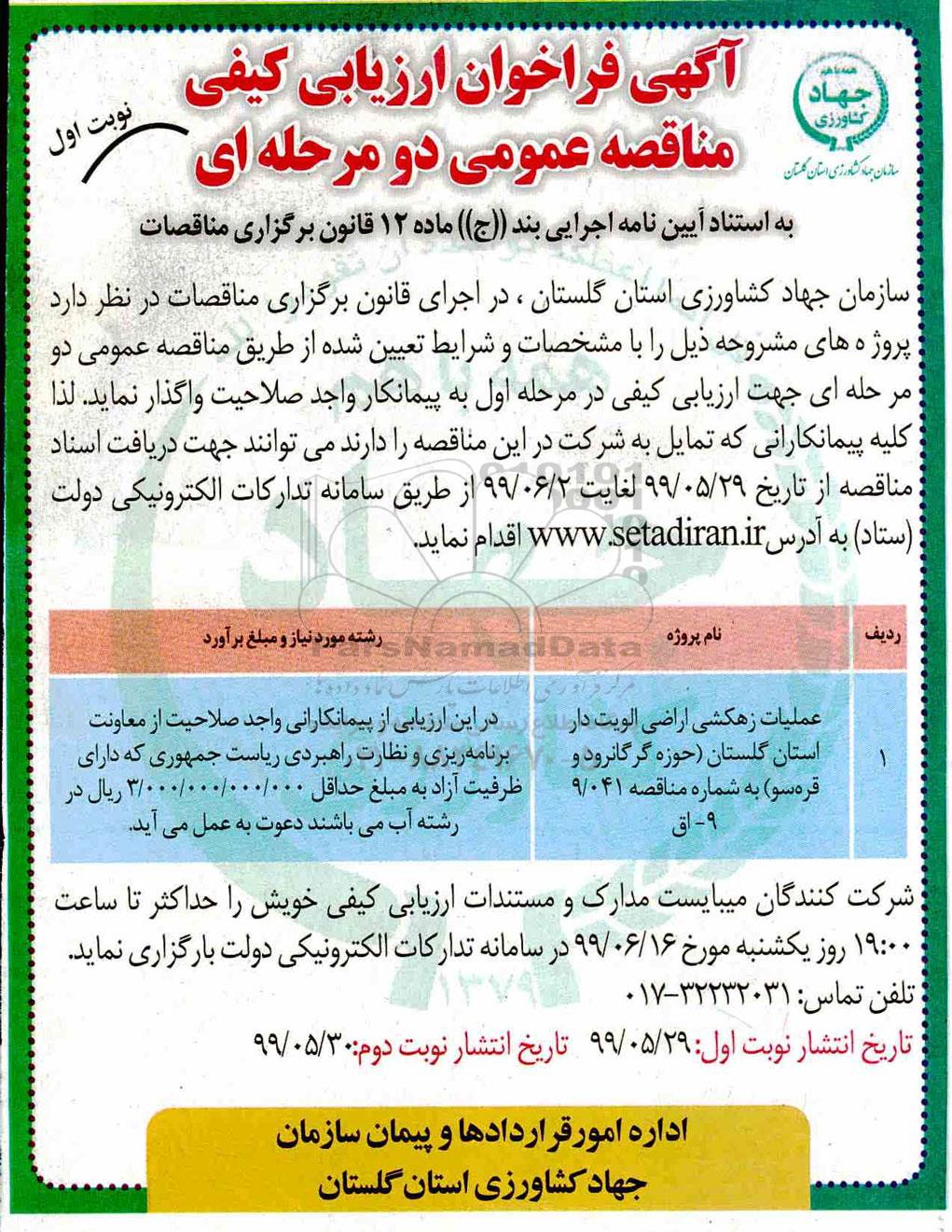 سازمان جهاد کشاورزی استان گلستان در نظر دارد در اجرای قانون برگزاری مناقصات در نظر دارد پروژه های مشروحه ذیل را با مشخصات و شرایط تعیین شده از طریق مناقصه عمومی دو مرحله ای جهت ارزیابی کیفی در مرحله اول به پیمانکار واجد صلاحیت واگذار نماید. لذا کلیه پیمانکارانی که تمایل به شرکت در این مناقصه را دارند می توانند جهت دریافت اسناد مناقصه از تاریخ 99.5.29 لغایت 99.6.2 از طریق سامانه تدارکات دولت ستاد به ادرس سایت ستاد برگزار نماید